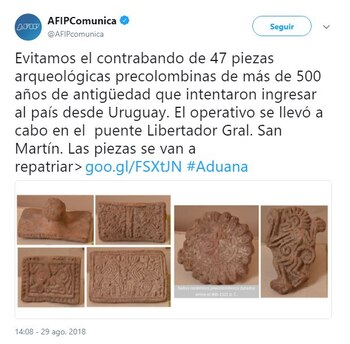 A través de la Aduana, la Administración Federal de Ingresos Públicos (Afip) impidió que 47 piezas arqueológicas precolombinas de más de 500 años de antigüedad cruzaran el Río de la Plata e ingresaran desde Uruguay a través de la provincia de Entre Ríos.