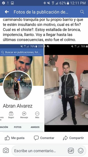 La denuncia sobre Abran Álvarez (así se hace llamar el hombre en su cuenta de Facebook) data del día 27 de agosto. Fue, quizá, la noche del hartazgo. O la del temor más profundo. "Esta situación de violencia ocurrió -ante todo- por el odio que le provoca verme así. Se llama transfobia, que no es más que lo que me pasó a mí: sufrir actitudes negativas hacia las personas transgénero o transexuales y expresarlas a través de la violencia. Esta persona es vecino mío y me empezó agredir de la nada, como tantas veces. Esta vez me acerqué a preguntarle cuál era el problema que tenía conmigo o qué le molestaba de mí. No me dijo nada. Me respondió con tres trompadas en la cara y se fue", explicó Mia a Infobae.