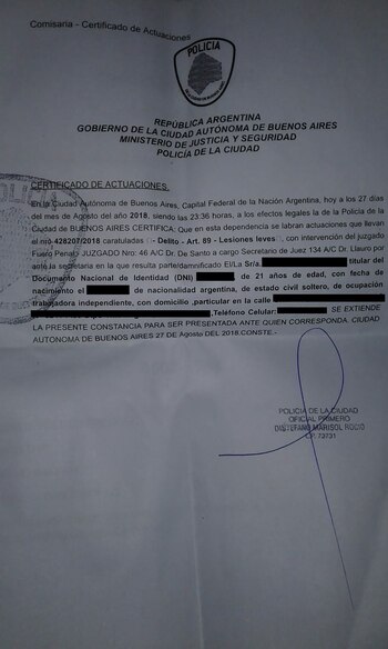 La joven hizo la denuncia policial la misma noche en que fue golpeada. "Hasta el día de hoy se que no se contactaron con él ni vinieron a hasta su domicilio, porque dejé todos los datos y nada. Tampoco nadie se acercó hablar conmigo o a preguntarme qué pasó. Nadie hizo nada", agregó.