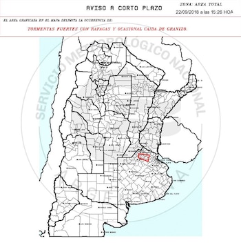 Horas más tarde, actualizó el comunicado, señalando que el alerta por tormentas fuertes y caída de granizo rige para la Ciudad de Buenos Aires y las localidades de Almirante Brown, Avellaneda, Berazategui, Berisso, Brandsen, Carmen de Areco, Castelli, Cañuelas, Chascomús, Ensenada, Escobar, Esteban Echeverría, Exaltación de la Cruz, Ezeiza y Florencio Varela.