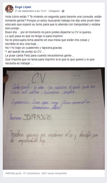 Un breve currículum prolijamente escrito a mano con lapicera sobre una hoja rayada de cuaderno conmovió a la empleada de un comercio en la ciudad de Córdoba. La imagen, que ella misma compartió en las redes sociales, rápidamente se viralizó y fue replicada más de 5 mil veces.