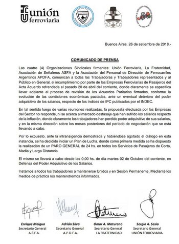 Los gremios agregaron que "agotado el diálogo" con las empresas, se decidió iniciar un plan de lucha, donde como primera medida se ha resuelto un paro general por 24 horas en los servicios de pasajeros de corta, media y larga distancia.