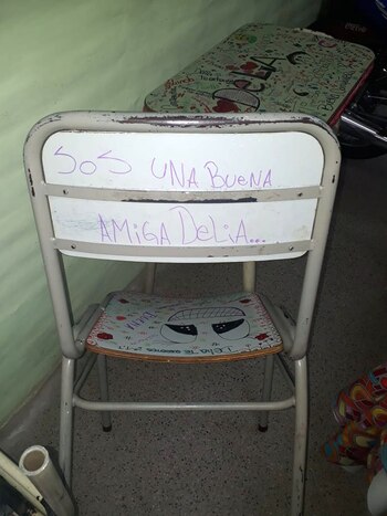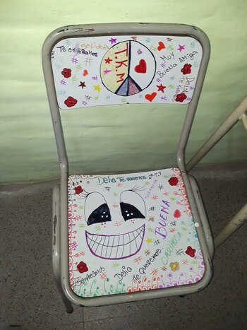 Mientras esperan por alguna novedad, sus compañeros del Ipem N°137 "Carolina Lucero de Funes" pintaron su escritorio con mensajes alentadores, flores y corazones. Cualquier información deberá ser comunicada a la Unidad Judicial en San Martín 156 de la Ciudad de Villa Dolores, teléfono 03544-424778, a la Comisaría de la Paz teléfono 03544-496600, o a la dependencia policial más cercana.