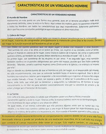 El material, cargado de argumentos religiosos, explica que en su primeras líneas que "dentro del hogar la función esencial del hombre es ser el jefe" y "ese someterse de las mujeres es por amor". Y refuerza: "Al hombre le surge naturalmente su rol líder".