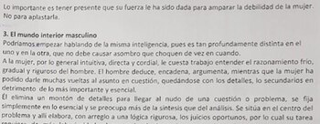 El material explica que a la mujer "le cuesta trabajo entender el razonamiento frío, gradual y riguroso del hombre" y enseña que "el hombre deduce, encadena, argumenta, mientras que la mujer ha podido darle muchas vueltas al asunto en cuestión, quedándose con los detalles secundarios en detrimento de lo más importante y esencial".