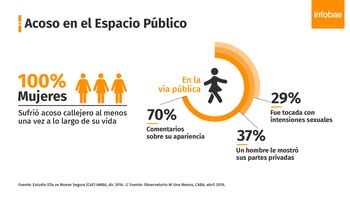 En la vía pública el 70% de las mujeres admitió haber recibido comentarios sobre su apariencia, el 29% haber sido tocada con intenciones sexuales y el 37% que en alguna oportunidad un hombre le mostró sus partes privadas.