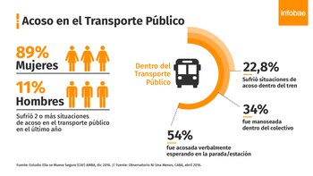 En el transporte público el 89% de las mujeres dijeron haber sufrido acoso en el último año. Un 54% recibió comentarios verbales mientras esperaba en la parada o en la estación, un 34% expresó que fueron manoseadas dentro del colectivo y un 22,8% que se vieron expuestas al acoso dentro del tren.