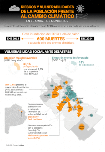 Los índices más altos se observan en los partidos de Malvinas Argentinas, José C. Paz, Moreno, La Matanza, Esteban Echeverría, Florencio Varela y algunos sectores de Tigre, Avellaneda, Quilmes, Almirante Brown y Berazategui. "Los efectos del cambio climático en la Región Metropolitana comienzan a ser cada vez más evidentes. Si se toma en cuenta la última gran inundación del 2013 [La Plata y zonas aledañas] y la ola de calor en la Ciudad, entre diciembre de 2013 y enero de 2014, se produjeron más de 600 muertes a causa de sólo dos eventos climáticos", explica a Infobae Ana Carolina Herrero, investigadora del Programa de Ciudades de Cippec que realizó la investigación junto a Claudia Natenzon y Mariela Miño.