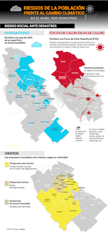 Las amenazas del cambio climático sobre la Región Metropolitana son la mayor frecuencia de inundaciones, olas de calor y tormentas severas. Este es el diagnóstico de los científicos expertos que colaboran con las Naciones Unidas para enfrentar este escenario dramático. Un estudio realizado por el think tank Cippec suma otra preocupación: los más pobres son los que corren más riesgo e identifica geográficamente los potenciales impactos.
