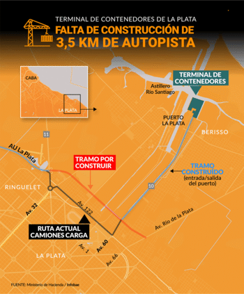 Por el momento, la terminal de contenedores de La Plata sí tiene conexión terrestre, pero la ruta que deben transitar los camiones de carga es a través de calles y avenidas que no están preparadas para soportar el tráfico semejante de una terminal operativa. Por eso, para poder iniciar su actividad, depende exclusivamente del tramo de tres kilómetros de autopista para unir al puerto con la Buenos Aires-La Plata.