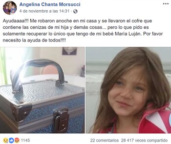 "Ayudaaaa!!! Me robaron anoche en mi casa y se llevaron el cofre que contiene las cenizas de mi hija y demás cosas… pero lo que pido es solamente recuperar lo único que tengo de mi bebé María Luján. Por favor necesito la ayuda de todos!!!!", posteó el domingo la mujer, desesperada por la situación que está viviendo.