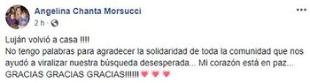 "¡Luján volvió a casa! No tengo palabras para agradecer la solidaridad de toda la comunidad que nos ayudó a viralizar nuestra búsqueda desesperada. Mi corazón está en paz", sostuvo Angelina, quien perdió a su pequeña hace seis años.