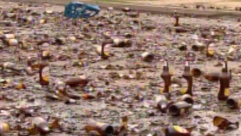 En el suelo quedó formada una verdadera alfombra de vidrio de unos 30 metros de largo, formada por varios centenares de botellas de cerveza rotas.