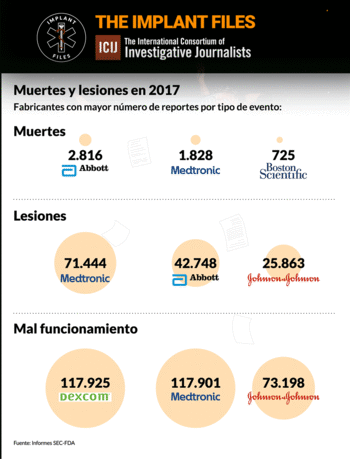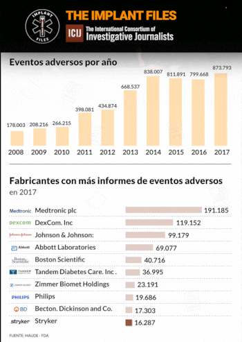 Un análisis de ICIJ de los informes de eventos adversos presentados ante los autoridades regulatorias de los Estados Unidos revela que Medtronic es la fabricante de dispositivos médicos con más efectos adversos reportados el año pasado: 191.185. De esta cifra, 1.828 se vincularon oficialmente a muertes, 71.444 a lesiones, y 117.901 a mal funcionamiento de los dispositivos.