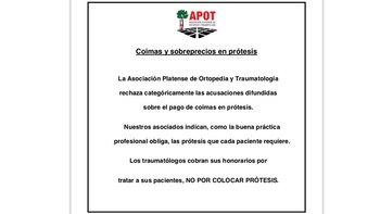 Desde la Asociación Platense de Ortopedia y Traumatología (APOT), en un comunicado rechazaron "categóricamente las acusaciones difundidas sobre pagos de coimas en prótesis" y sostuvieron que sus asociados "indican, como la buena práctica profesional obliga, las prótesis que cada paciente requiere".