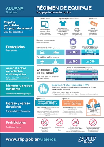 Con la nueva modificación de la franquicia individual, publicada a fines de septiembre en el Boletín Oficial, el viajero ahora puede ingresar artículos por un valor de u$s 500 (antes era de u$s 300) si la hace por vía área. Los menores de 16 años, en cambio, gozan de la mitad de la franquicia. Y si lo ingresado sobrepasa esas cifras deberá pagar un 50% del excedente.