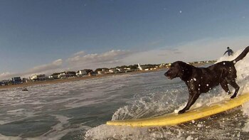 Goro tiene 8 años y surfea desde los 4 meses de vida. Siendo cachorro, aprendió siguiendo a su dueño cuando éste se adentraba al mar.