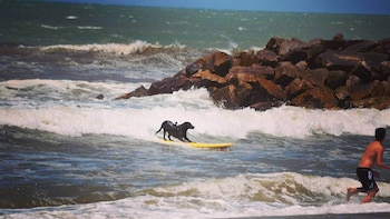 Ocurre lo mismo cada día. Ya es una costumbre entre los turistas que llegan a Miramar. Mientras disfrutan de las playas, los visitantes se congregan a orillas del agua para sacarle fotos y filmar con sus teléfonos celulares la notable actuación de Goro, un perro surfista que desde hace años es una de las grandes atracciones de la ciudad balnearia.