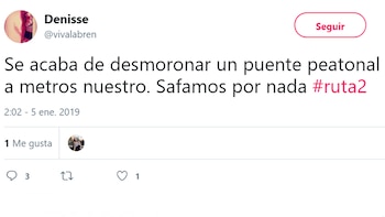 Una automovilista, que circulaba por allí, contó en su cuenta de Twitter que se salvó de milagro: "Se acaba de desmoronar un puente peatonal a metros nuestro. Safamos por nada #ruta2", relató Denisse desde @vivalabren.