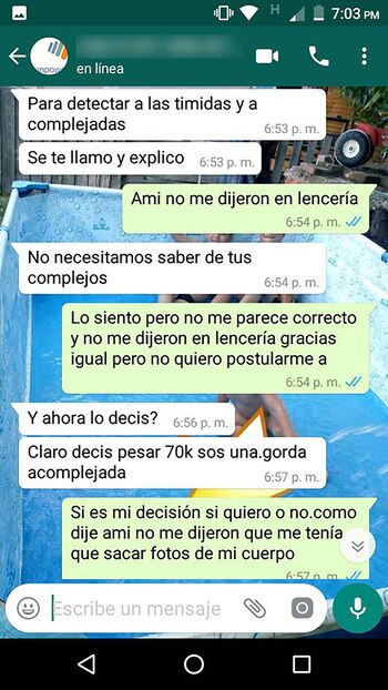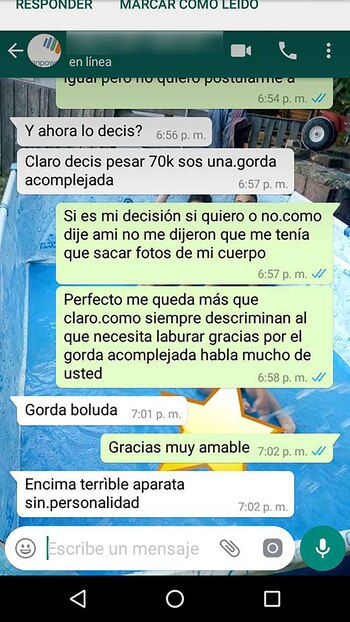 "Para detectar a las tímidas", le argumentaron. "Lo siento pero no me parece correcto y no me dijeron en lencería. Gracias, igual no quiero postularme", escribió Daiana. "¿Y ahora lo decís? Claro, decís pesar 70 kilos, sos una gorda acomplejada", recibió como respuesta.