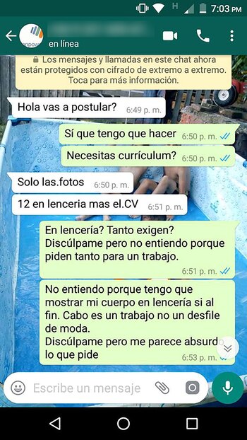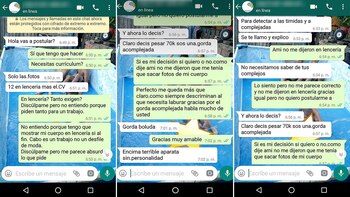 El diálogo ocurrió este lunes por la tarde. "Hola, ¿vas a postular?", le escribieron. Daiana preguntó qué tenía que hacer y ofreció su currículum. "Sólo las fotos. 12 en lencería más el CV", le respondieron. "¿En lencería? ¿Tanto exigen? Disculpame pero no entiendo por qué piden tanto para un trabajo. No entiendo por qué piden tanto para un trabajo. No entiendo por qué tengo que mostrar mi cuerpo en lencería si al fin y al cabo es un trabajo, no un desfile de moda. Disculpame pero me parece absurdo lo que piden", contestó la joven.