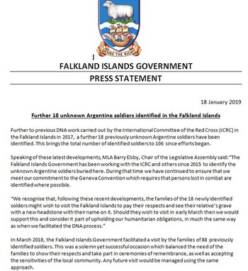El texto hizo referencia al gran trabajo realizado por el Comité de la Cruz Roja Internacional en relación a los ADN de los caídos: "Se han identificado otros 18 soldados argentinos previamente desconocidos. Esto eleva el número total de soldados identificados a 106 desde que comenzaron los trabajos", puntualizó el escrito.