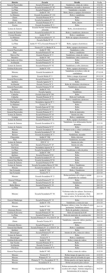 Durante el último trimestre (diciembre 2018, enero y febrero en curso) 96 escuelas fueron vandalizadas en la Provincia de Buenos Aires. Para poner en contexto la gravedad de la cifra hay que remarcar que en todo 2018 fueron 131 los establecimientos educativos dañados.
