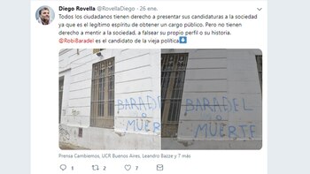 Pero los hechos policiales tienen su correlato político. En plena discusión paritaria y con una relación tensa entre el Gobierno de la Provincia y los gremios docentes, el diputado provincial por la UCR Diego Rovella lanzó una dura acusación. A través de un tuit publicado el 26 de enero pasado, responsabilizó a personas cercanas al secretario general de Suteba, Roberto Baradel, por pintadas en una escuela secundaria platense. "Repudio los actos de vandalismo sobre la Escuela Secundaria N° 31 de La Plata por parte de afines de @RobiBaradel", escribió.
