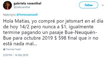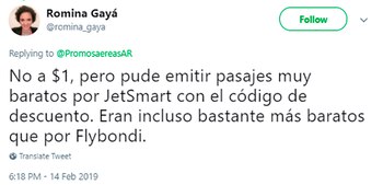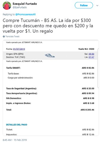 Desde su cuenta de Twitter, Ezequiel Furtado también hizo alusión a esa situación: "Compré Tucumán – Bs As. La ida por $300 pero con descuento me quedo en $200 y la vuelta por $1. Un regalo". Y subió a modo de ejemplo el comprobante que le emitió el sitio web para volar el 1 de julio.