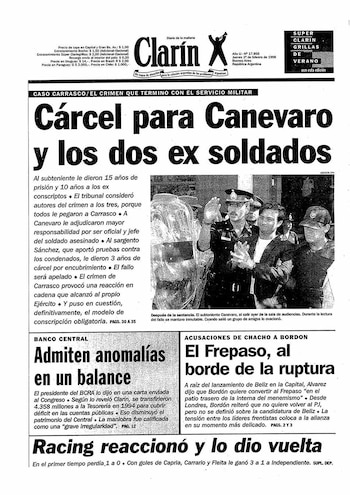 En la tele, María Laura Santillán recibía en su programa "Causa Común" a Eudoro Palacio. Su hijo Daniel había muerto luego de una golpiza en 1983 mientras cumplía el servicio militar en Campo de Mayo. Desde que fue creado en 1977 y hasta la muerte de Carrasco, en 1994, el Frente Opositor al Servicio Militar Obligatorio (Fosmo) contabilizaba 34 casos de soldados muertos o desaparecidos mientras cumplían el servicio militar. Esos eran los casos que habían tenido difusión en la prensa. La cifra, decían, era muchísimo mayor.