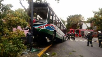 Lo cierto es que el colectivo terminó con la parte delantera suspendida en el aire, a un metro de altura, y apoyado sobre las ruedas duales traseras y sobre una columna de iluminación.