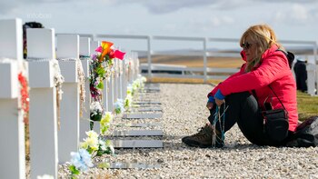 (Enviado a las Islas Malvinas) Apenas pasaron las 9 de la mañana en el cementerio de Darwin, en las Islas Malvinas. Los termómetros de los teléfonos celulares reflejan unos 3º centígrados, pero no hace frío. Casi no hay viento y el sol logró arruinar la amenaza de precipitaciones y abundancia de nubes. Decenas de rodillas se desploman sobre el mármol negro, ubicado sobre piedras blancas y delante de una cruz del mismo color. El silencio apenas se ve alterado por sonidos guturales de angustia. No hay gritos, no hay exclamaciones. El cementerio respira el sonido de llantos ahogados.