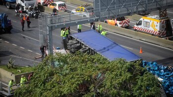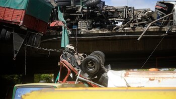 Un increíble accidente entre camiones ocurrió cerca de las 11 de la mañana en la autopista 25 de Mayo, a 500 metros de la bajada de Boedo sentido a Liniers, que de milagro no tuvo víctimas fatales.