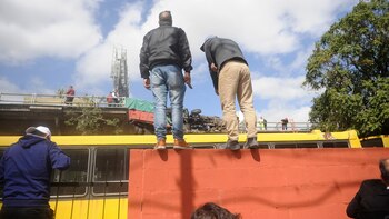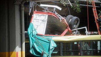 El camión que fue chocado destruyó el guardarrail en su caída e impactó en el techo de un colectivo que estaba estacionado abajo, en una terminal donde finalizan su recorrido varias líneas.
