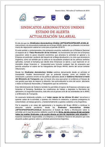 El comunicado, firmado por los secretarios generales de APTA, APA, UPSA, APLA Y UALA, decretaron el "Estado de Alerta y Movilización sobre la actividad, por lo que llevaremos adelante a partir de las 00 hs. del día viernes 29 del corriente todas las medidas sindicales y de acción directa en pos de regularizar esta situación. Hacemos totalmente responsables a la Empresa y al gobierno nacional del perjuicio que esta situación pudiera generar sobre la actividad aerocomercial argentina".