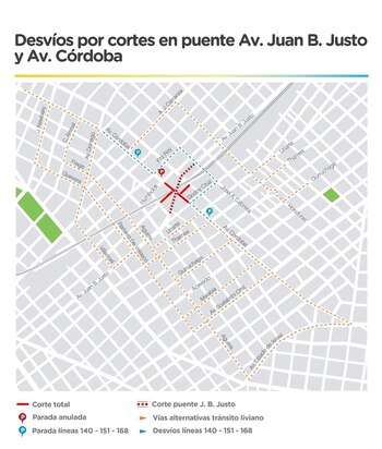 – Por el corte en avenida Córdoba, las líneas de colectivos 140 (Correo Central/Boulogne), 151 (Constitución/Puente Saavedra) y 168 (Constitución/Puente Saavedra) se desviarán por avenida Córdoba, Godoy Cruz, Cnel. J. A. Cabrera, Fitz Roy y retomarán en avenida Córdoba. Las paradas ubicada en av. Córdoba entre Fitz Roy y Godoy Cruz quedarán desafectadas.