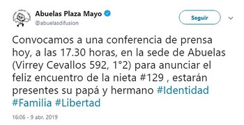 En la cuenta oficial de Twitter, desde Abuelas de Plaza de Mayo publicaron: "Convocamos a una conferencia de prensa hoy, a las 17.30 horas, en la sede de Abuelas (Virrey Cevallos 592, 1°2) para anunciar el feliz encuentro de la nieta #129 , estarán presentes su papá y hermano".