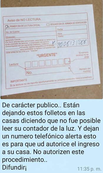 "Están dejando estos folletos en las casas diciendo que no fue posible leer su contador de la luz. Y dejan un número telefónico que alerta esto, es para que usted autorice el ingreso a su casa. No autoricen este procedimiento", fue una de las advertencias que circularon en WhatsApp.