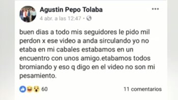 Distintos medios reportaron a su vez que Tolaba había ensayado una disculpa a través de sus redes sociales, donde aseguro que estaba bromeando y que sus dichos no reflejaban sus verdaderos pensamientos. Sin embargo, la cuenta desde la cual se hizo la publicación fue eliminada en las ultimas horas.