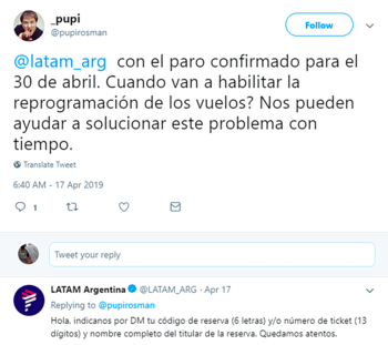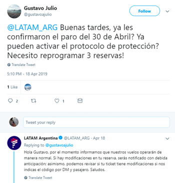 "@LATAM_ARG Buenas tardes, ya les confirmaron el paro del 30 de Abril? Ya pueden activar el protocolo de protección? Necesito reprogramar 3 reservas!", le pidió Gustavo Julio a la compañía aérea.