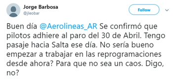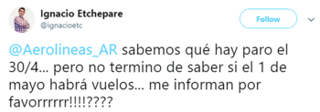 "@Aerolineas_AR sabemos qué hay paro el 30/4… pero no termino de saber si el 1 de mayo habrá vuelos… me informan por favorrrrrr!!!!????", se pregunta Ignacio Etchepare en su cuenta de Twitter. A lo que otro usuario le responde: "Si te responden avisa… yo no logré nada".
