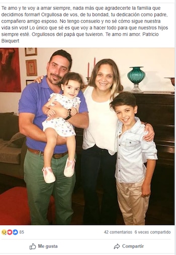 "No tengo consuelo y no sé cómo sigue nuestra vida sin vos! Lo único que sé es que voy a hacer todo para que nuestros hijos siempre estén orgullosos del papá que tuvieron. Te amo mi amor. Patricio Bixquert", concluye el mensaje.