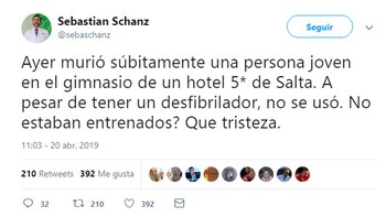 Según medios locales, los testigos del hecho informan que el elemento no fue usado. Y Sebastián Schanz, ex presidente de la Sociedad de Cardiología de Salta, aseguró lo mismo en un tuit. "¿No estaban entrenados? Qué tristeza", indica el mensaje.