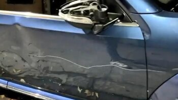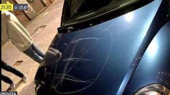 Luego de realizar estas abolladuras, procedió a rayar el auto con lo que parece ser una llave. Además de trazar líneas verticales y horizontales, también "talló" el símbolo de "prohibido estacionar" en el capot.