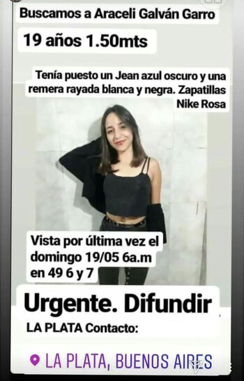 Desde ese momento, se inició una campaña con diferentes posteos en los que se brindaban datos sobre la chica desaparecida. Araceli mide 1,50 m. y al momento de su desaparición tenía puesto un jean azul oscuro, una camiseta rayada blanca y negra y unas zapatillas rosas.