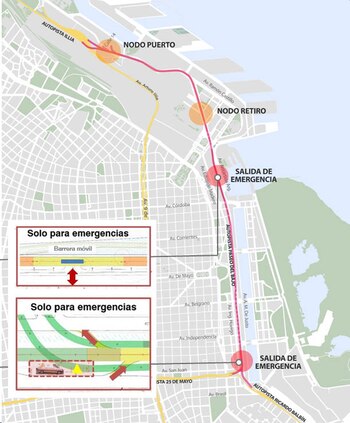 1. Los pesados contarán con un carril exclusivo sin salidas que dependiendo el tramo estará soterrado (subterráneo), al nivel del suelo o en viaducto (en elevación). Quienes circulen por allí sólo podrán salir a la altura de alguno de los tres distribuidores de la traza: Distribuidor Sur, Distribuidor Retiro o Distribuidor Norte.