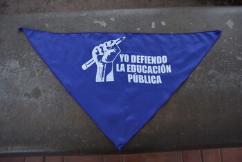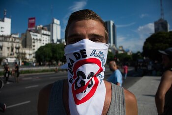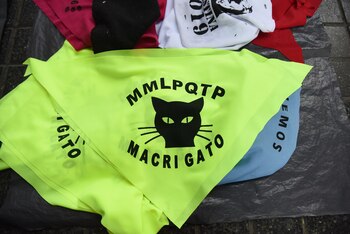 Ernesto es técnico en refrigeración. Instala aires acondicionados y trabaja como empleado en un comercio, pero cuando hay marcha aprovecha a hacer unos pesos extra vendiendo pañuelos. Arriba del paño se suman a los anteriores el amarillo de "Fuera Macri", el fucsia de "No al maltrato animal" y una curiosidad: "Maduro coño e'tu madre".