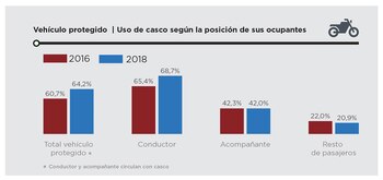 El Ministerio de Transporte, a través de la Agencia Nacional de Seguridad Vial, realizó un estudio a nivel país sobre las conductas de los argentinos al volante para completar su anuario estadístico. El relevamiento evidenció que el 68,7% de los conductores de motovehículos circulan protegidos mediante el uso de casco. La proporción desciende al 42% entre un acompañante y al 20,9% entre el resto de los ocupantes. "Si se comparan los resultados respecto de la medición llevada a cabo en 2016, se observa que el uso de casco crece únicamente entre conductores (del 65,4% al 68,7%) y que la protección del resto de las posiciones se mantiene estable", agrega el informe.