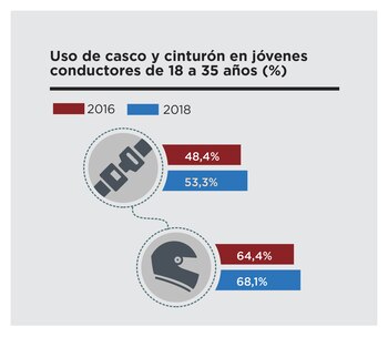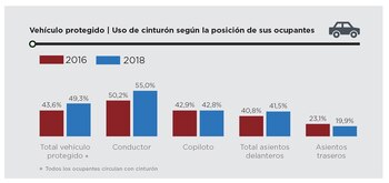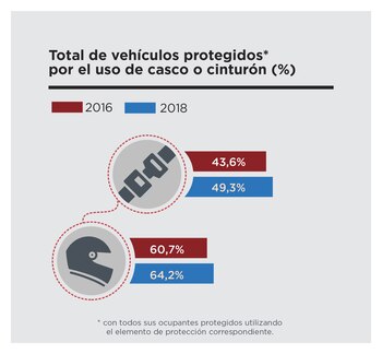 Las víctimas que viajaban en autos fueron 1.479, el 27,6%. En las estadísticas de 2017, el porcentaje era del 31%. Los resultados de la investigación llevada a cabo por la ANSV demuestra que más de 1,5 millones de personas que circulan en auto pasaron a utilizar el cinturón de seguridad. A nivel nacional, el estudio arrojó que sólo el 55% de los conductores lo usan: la proporción se reduce al 42,8% entre copilotos y al 19,9% entre ocupantes traseros. Hubo una evolución en la conciencia vial de los argentinos: "Respecto de la última medición -apunta el informe-, se observa un crecimiento del uso del cinturón únicamente entre conductores (del 50,2% en 2016 al 55% en 2018)".