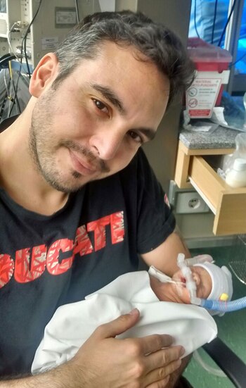"Fue tan difícil que me tuvieron que sacar del quirófano. Vinieron dos enfermeras a atenderme", cuenta él. "Me quedé del otro lado de la puerta, fueron unos minutos eternos, hasta que escuché que adentro gritaron '¡lo tenemos, lo tenemos de vuelta!'. Después salió el jefe de neo y como pude me paré. Me dijo 'vení, abrazame, tu bebé está bien".